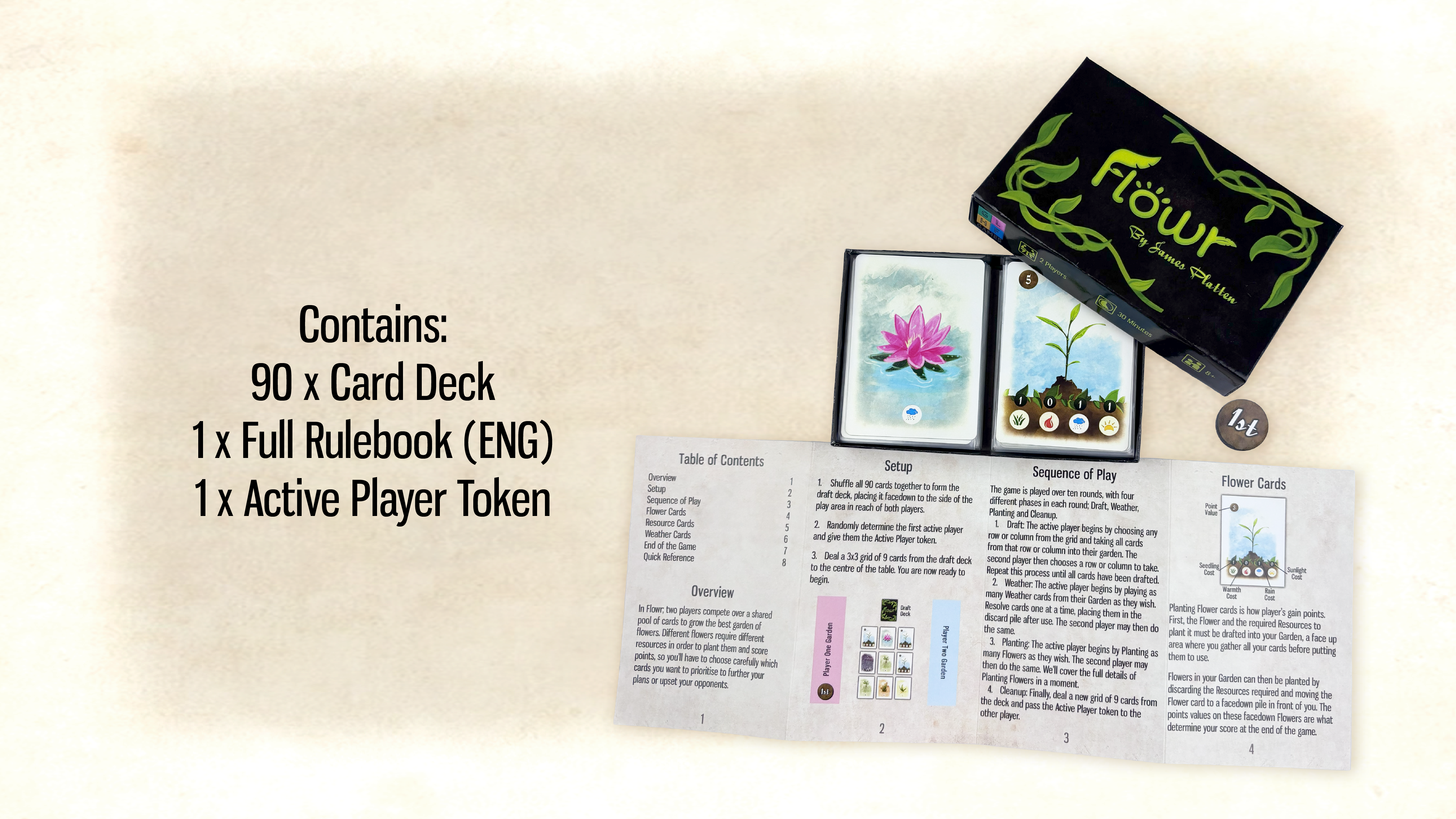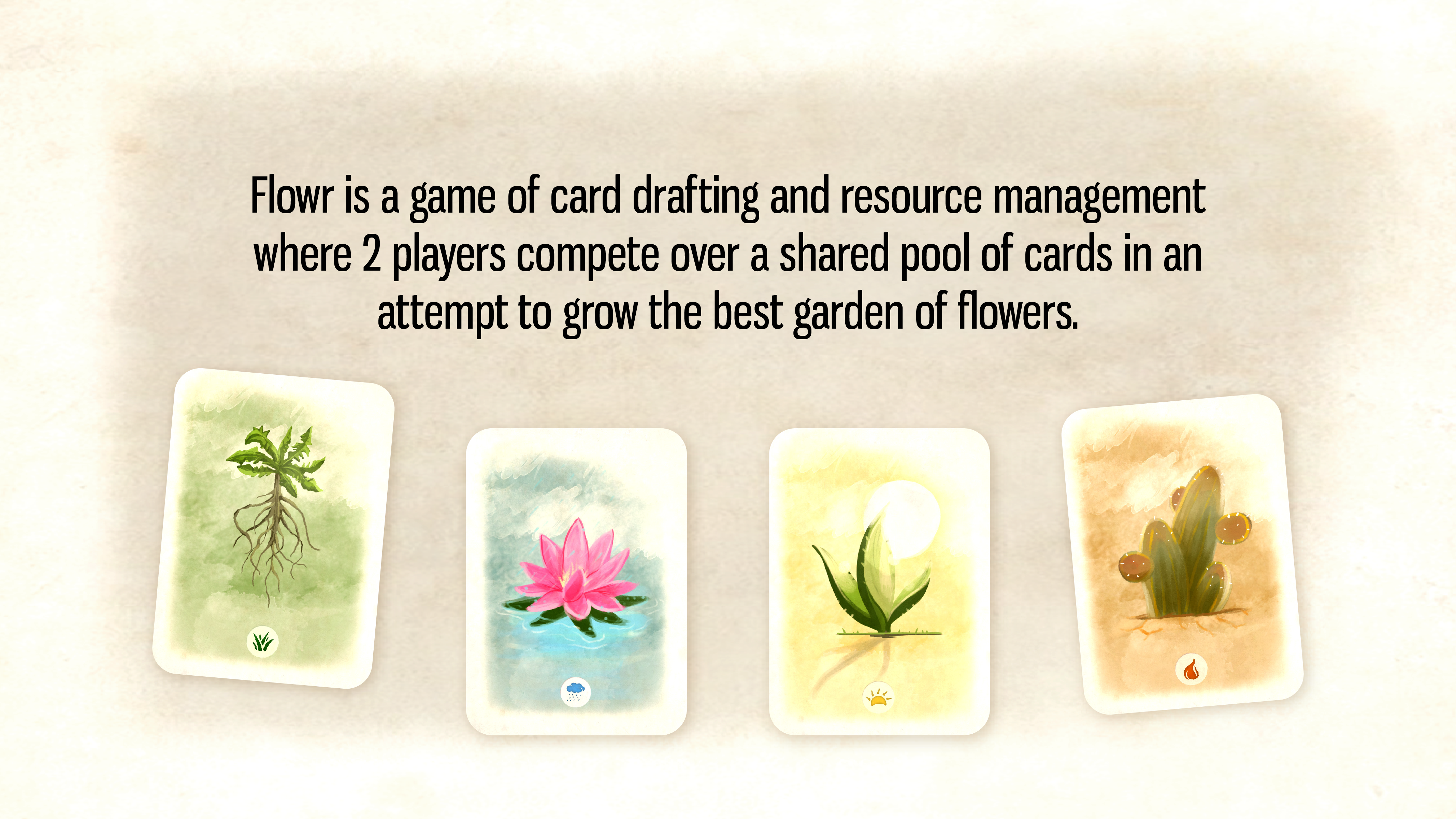 Flowr. A quick and easy card drafting game for 2 players. Collect resources, plant flowers and watch out for the weather!